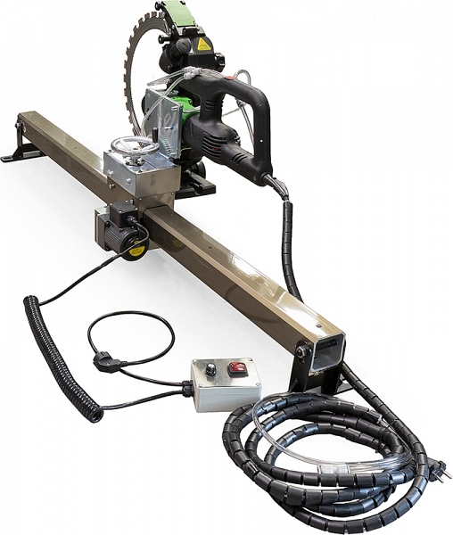 Автоматическая ручная электрическая направляющая шина для кольцерезов Diamaster Automatic 1500 мм (Диамастер Автоматик 1500 мм) – автоматическая направляющая система с электрической подачей для прямолинейного реза с использованием электрических кольцерезов по бетону Diamaster Titan-400 и Diamaster Titan-400 V2, а также других производителей. Используется в случаях, когда требуется идеально ровный рез под прямым углом к поверхности.