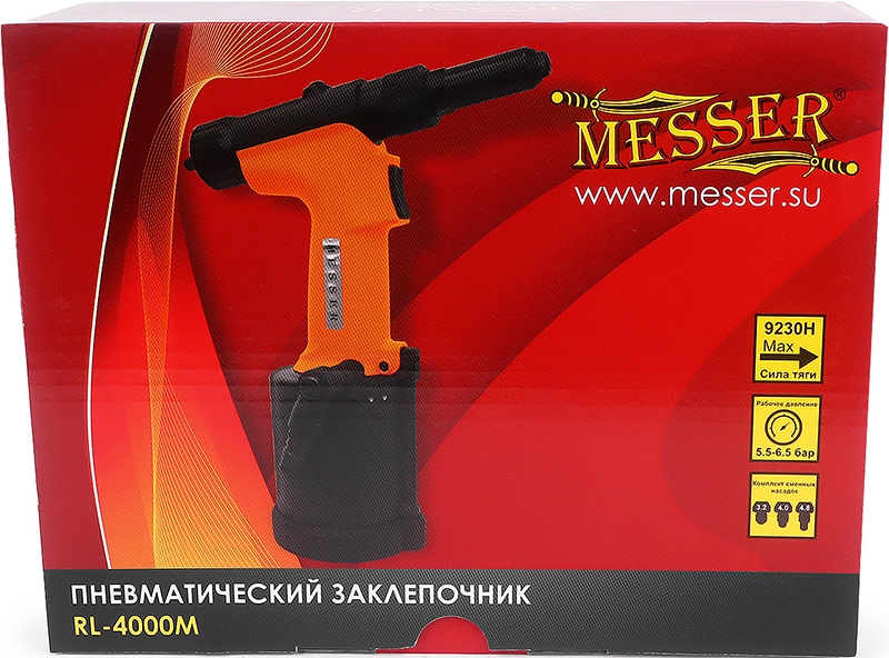 Пневматический вытяжной заклепочник Messer RL-4000M (Мессер РЛ-4000М) – надежный профессиональный пневмозаклепочник (пневмо заклепочный пистолет) для установки металлических (алюминиевых, медных, стальных,  нержавеющих стальных) вытяжных заклепок Ø 3,2 – 4,8 мм.