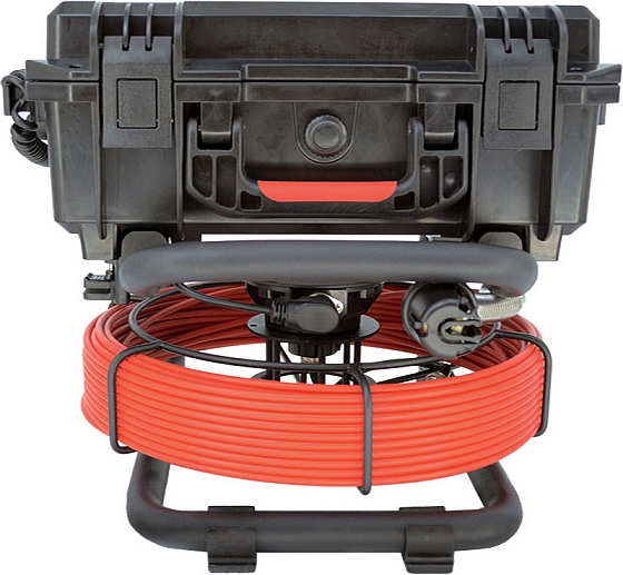 - Головка камеры Ø 21 × 45 мм и проталкиваемый кабель Ø 5,3 мм × 30 м из стекловолокна со счетчиком длины, подходящие для труб Ø 50 – 125 мм