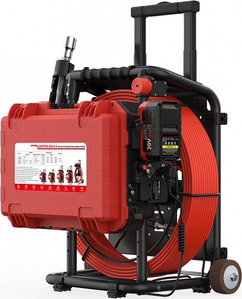 - Головка камеры Ø 29 × 50 мм и проталкиваемый кабель Ø 6,8 мм × 50 м из стекловолокна со счетчиком длины и системой торможения, подходящие для труб Ø 50 – 200 мм