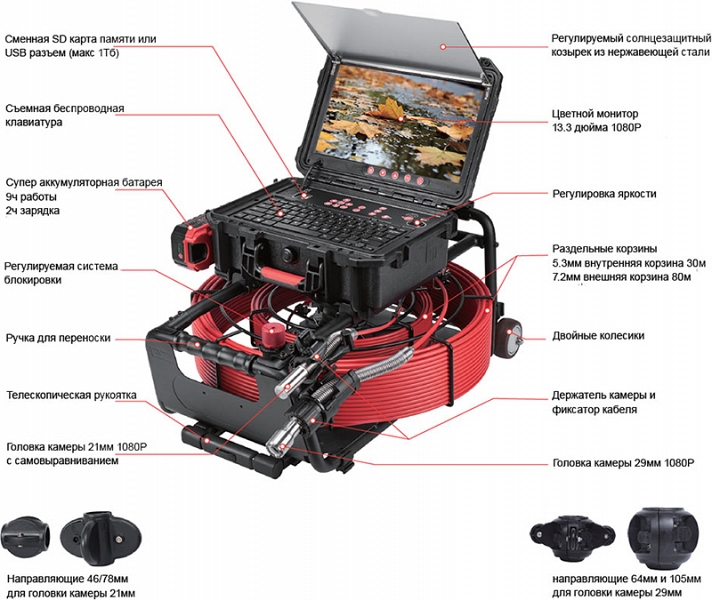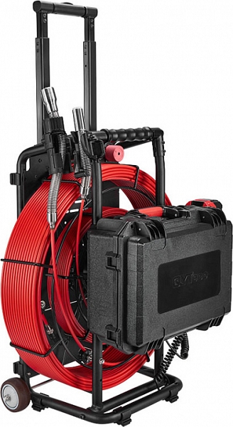 - Головка камеры Ø 29 × 50 мм и проталкиваемый кабель Ø 7,2 мм × 80 м из стекловолокна со счетчиком длины и системой торможения, подходящие для труб Ø 80 – 200 мм