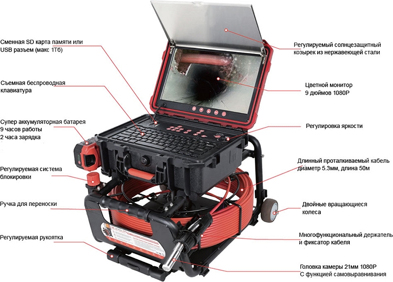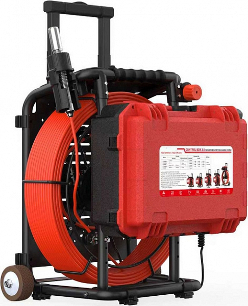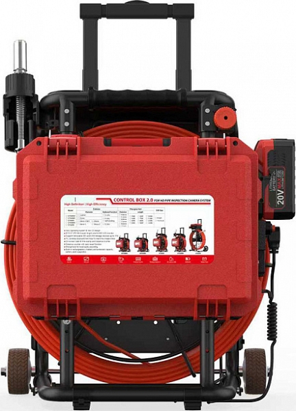 - Головка камеры Ø 21 × 45 мм и проталкиваемый кабель Ø 5,3 мм × 40 м из стекловолокна со счетчиком длины и системой торможения, подходящие для труб Ø 50 – 125 мм